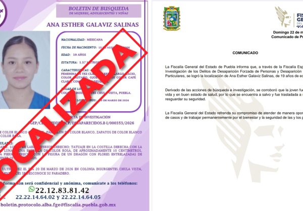 La Fiscalía General del Estado de Puebla informó la localización con vida de Ana Esther Galaviz Salinas, de 19 años