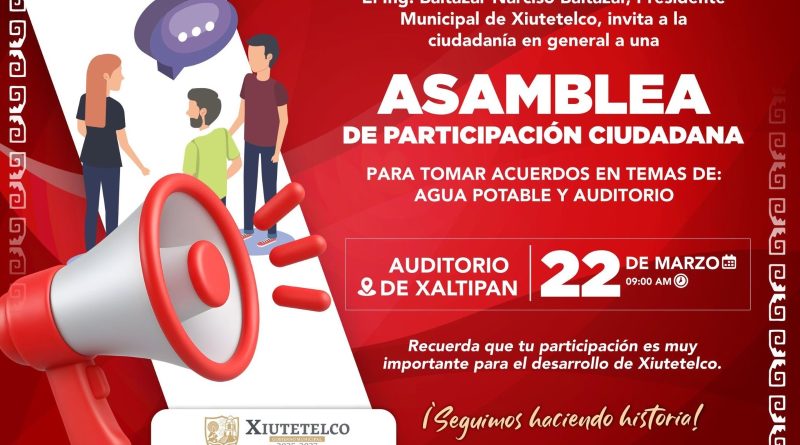 El presidente municipal de Xiutetelco, Ing. Baltazar Narciso Baltazar, continúa consolidando un gobierno cercano a la gente al convocar a la Asamblea de Participación Ciudadana en la localidad de Xaltipan, donde se abordarán temas prioritarios para la comunidad.