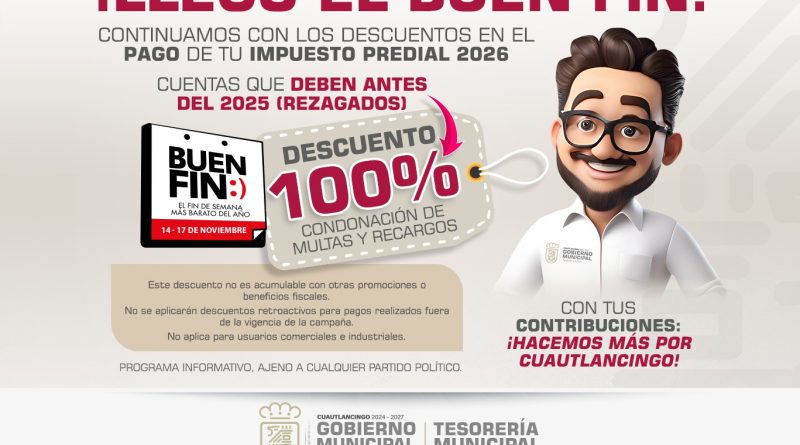 Durante el Buen Fin del 14 al 17 de noviembre, se aplicará un 20% de descuento en el pago del predial 2026 a personas al corriente y un 100% en multas y recargos a las morosas que deben antes del 2025.