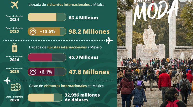La secretaria de Turismo del Gobierno de México, Josefina Rodríguez Zamora, informó que, de enero a diciembre de 2025, ingresaron al país 98.2 millones de visitantes internacionales, lo que representa un incremento de 13.6 por ciento respecto a 2024.