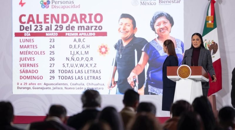 Del 23 al 29 de marzo, se realiza el registro a la Pensión para el Bienestar de las Personas con Discapacidad en todo el país. Exhortó a las personas a acudir a los Módulos de Bienestar que brindan atención de lunes a sábado, de 10:00 a 16:00 horas y cuya ubicación se puede consultar en la página oficial de la Secretaría de Bienestar www.gob.mx/bienestar.