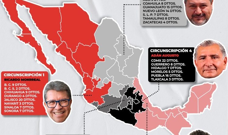 - Adán Augusto 4ª Circunscripción(CDMX): Ciudad de México, Guerrero, Morelos, Puebla, Tlaxcala.