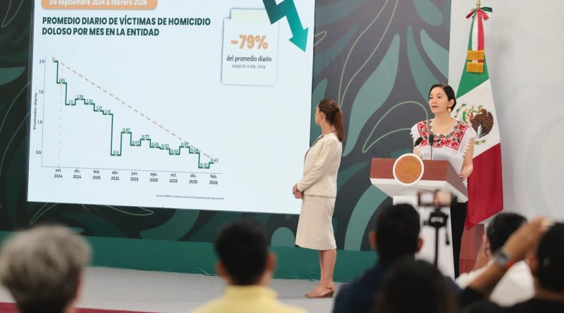 Desde Cancún, el Gobierno de México, a través del Gabinete de Seguridad, destacó durante la conferencia matutina: “Las mañaneras del pueblo”, de la Presidenta Claudia Sheinbaum Pardo, que en Quintana Roo el trabajo coordinado con el gobierno del estado logró una reducción de 79 por ciento en los homicidios dolosos, de septiembre de 2024 a febrero de 2026, al pasar de 2 a 0.43 el promedio diario de víctimas de ese delito; siendo febrero de 2026 el más bajo desde 2016.