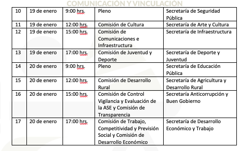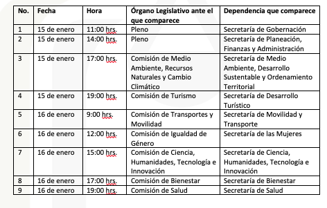 Del 15 al 20 de enero, ante el Pleno del Congreso y en Comisiones, se realizarán las comparecencias de las y los secretarios de las diferentes dependencias que integran el gabinete, mientras que el 21 de enero acudirá la titular de la Fiscalía General del Estado, informó el presidente de la Junta de Gobierno y Coordinación Política, Pavel Gaspar Ramírez.