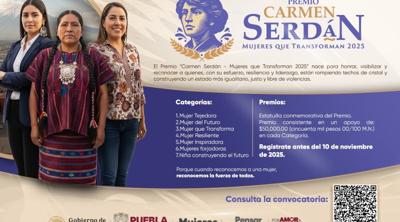 Las interesadas en participar en el Premio “Carmen Serdán, Mujeres que Transforman 2025”, pueden enviar sus postulaciones al correo secretaria.mujeres@puebla.gob.mx a más tardar el 10 de noviembre de 2025. La convocatoria completa puede consultarse en el sitio oficial: sm.puebla.gob.mx.