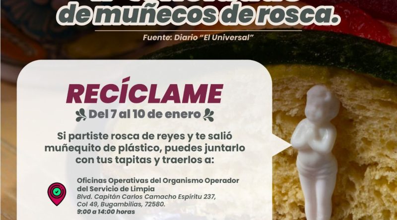 Para evitar que los muñecos de la Rosca de Reyes terminen en la basura, el Gobierno de la Ciudad de Puebla invita a la ciudadanía a reciclarlos y darles una segunda vida, a través de una campaña especial del Organismo Operador del Servicio de Limpia (OOSL).