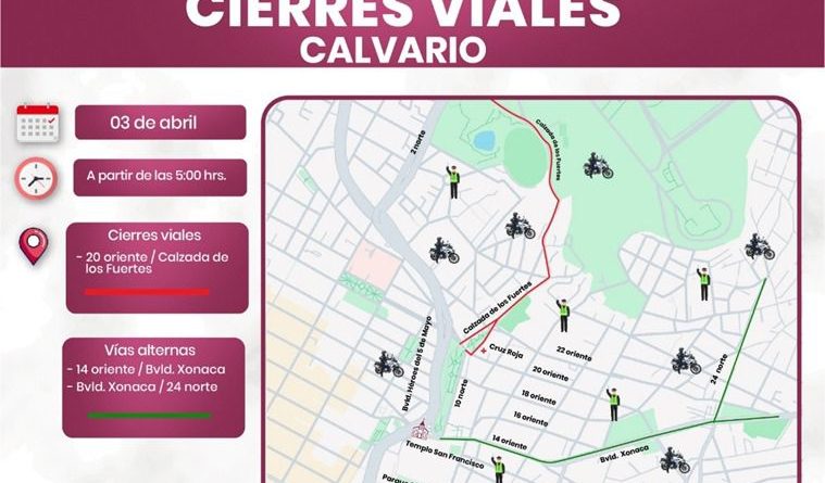 La Secretaría de Seguridad Ciudadana (SSC) del Gobierno de la Ciudad que encabeza el presidente municipal, Pepe Chedraui, informa que, el día 03 de abril del año en curso, la Dirección General de Control de Tránsito, realizará cierres totales a la circulación a partir de las 05:00 horas, con motivo de las actividades en la zona de El Calvario