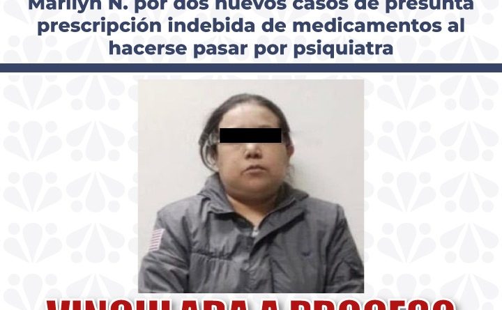 La Fiscalía General del Estado informa que, derivado de la investigación de dos nuevos casos denunciados en contra de Marilyn N., por presuntamente proporcionar atención psiquiátrica y prescribir medicamento controlado a pacientes haciéndose pasar como psiquiatra, se expusieron diversos datos de prueba ante la autoridad judicial, logrando su vinculación a proceso como probable responsable del delito de usurpación de funciones.